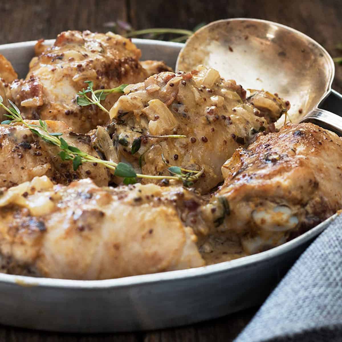 Season the chicken with salt and pepper and add it to the skillet. Add chicken to the honey garlic dijon sauce. Add wine, thyme, and bay leaf; Coq au vin kitchenaid brasil. Remove the chicken from the skillet and place on a plate.